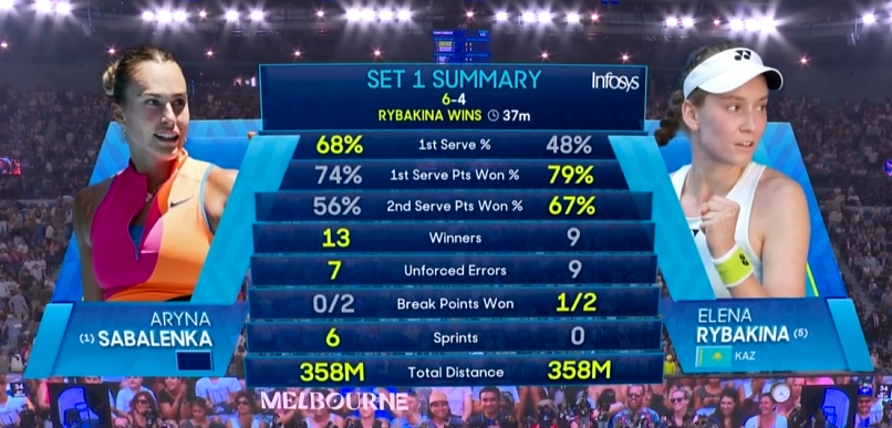 第一盘比分最后定格在6比4,莱巴金娜先下一城。两人首盘数据十分接近,但莱巴金娜在关键球上更胜一筹。