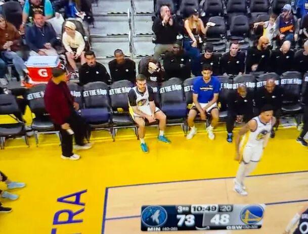仅剩受伤观战的库里、斯潘塞、莱昂斯三个人……